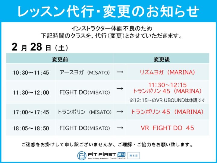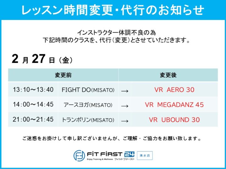 2月27日(金)・28日(土) レッスン代行・変更のお知らせ