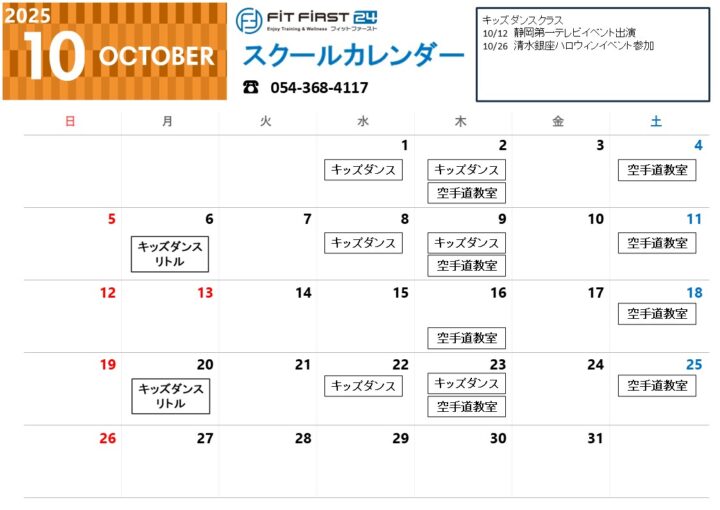 10月キッズスクールのスケジュールをお知らせいたします。キッズダンスが12日 26日とイベント参加します!是非応援ください。
