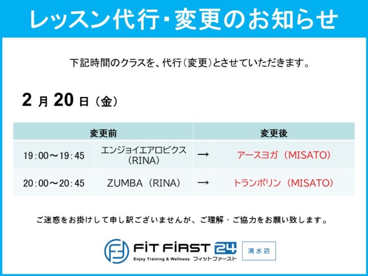 2月20日(金) レッスン代行・変更のお知らせ