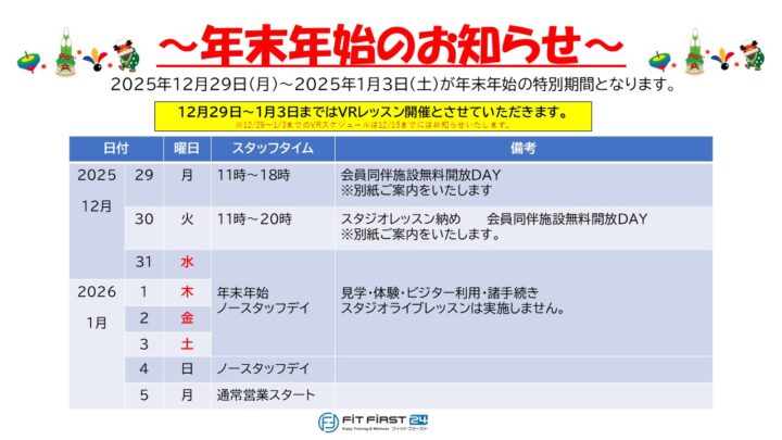 2025年 年末年始のスタッフタイムのお知らせです。よろしくお願いいたします!